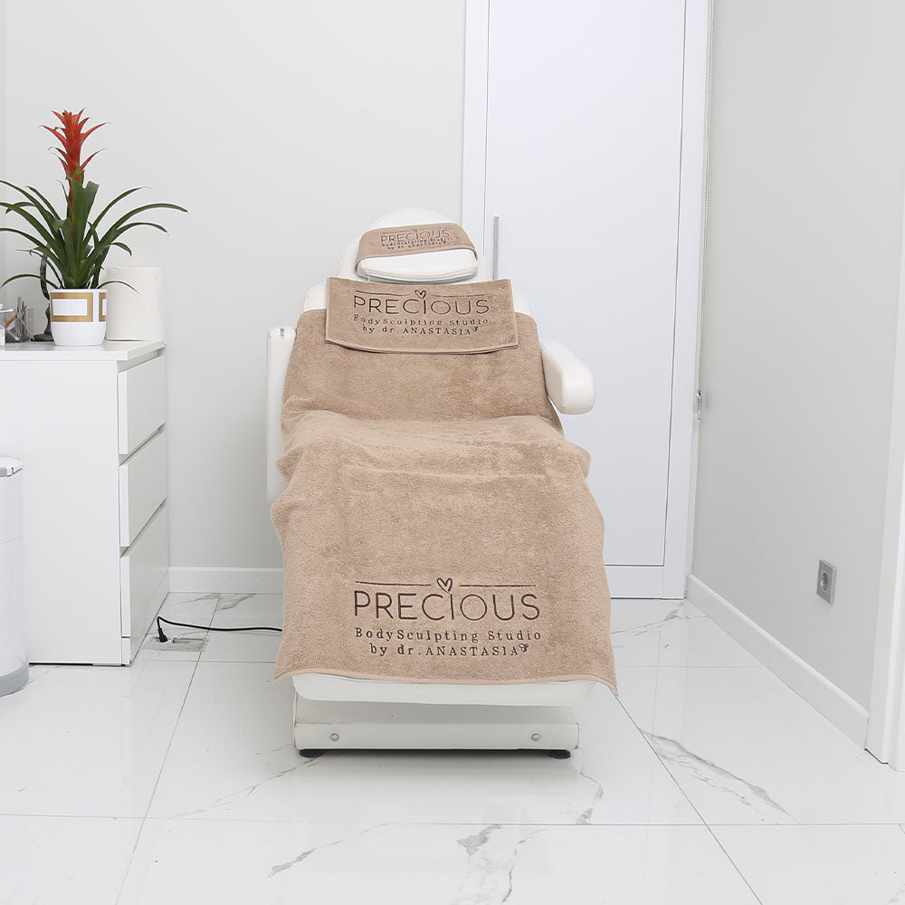 Perfect for a uniform studio setup: High-quality towels (70x140 cm) made of 100% organic cotton with your embroidered logo. Includes hand and face towels and headbands in sets of 10 or 20.